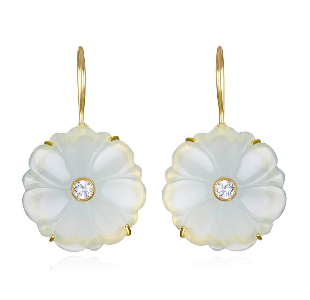 Softly sculptural and quietly luminous, these earrings from Amelia Rose Jewelry feature hand-carved pale green quartz accented with sparkling bezel-set CZ. The stones appear to float gracefully from French hook ear wires, creating gentle movement and an airy, elegant silhouette.