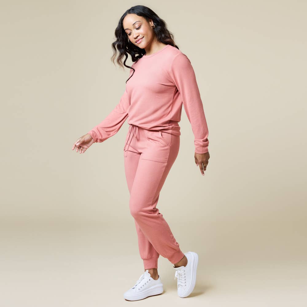 This dreamy, buttery loungewear set comes with an irresistibly soft crew neck top and matching joggers, and feels like cashmere on your skin.