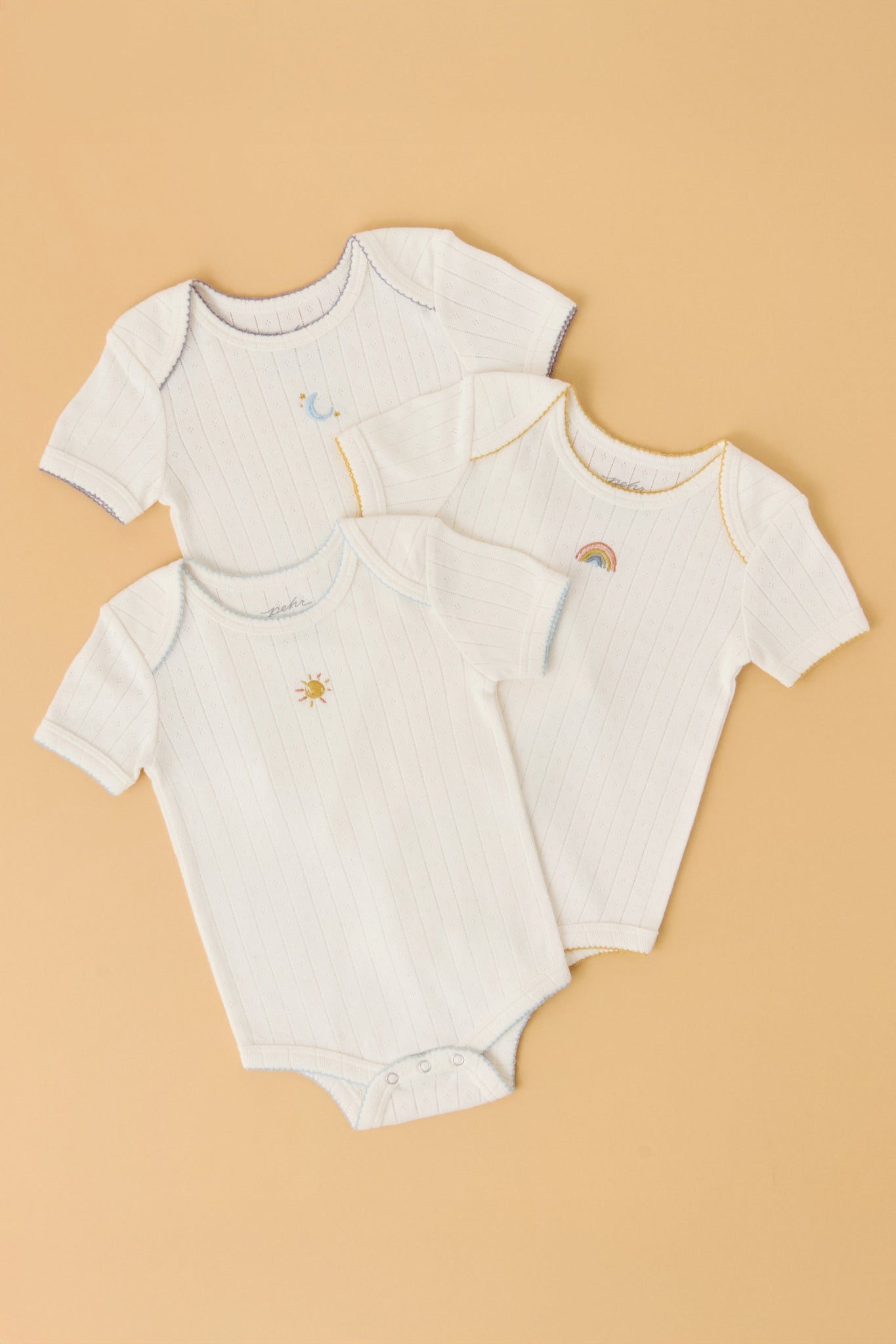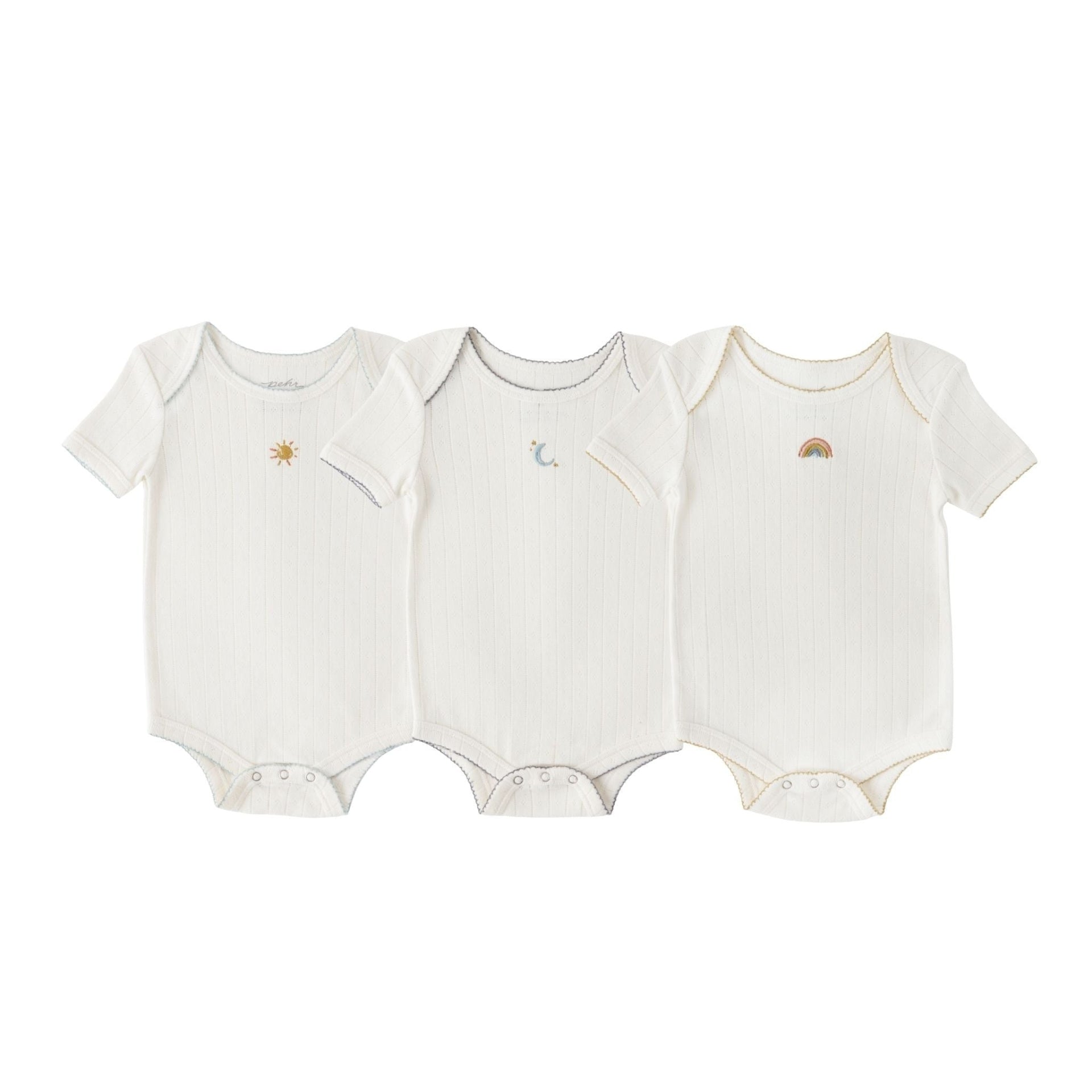 3-pack baby one-piece set, embroidered by theme with a gender-neutral palette