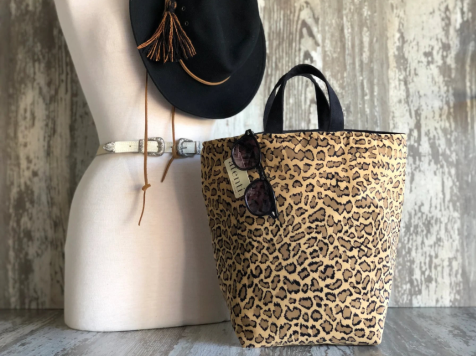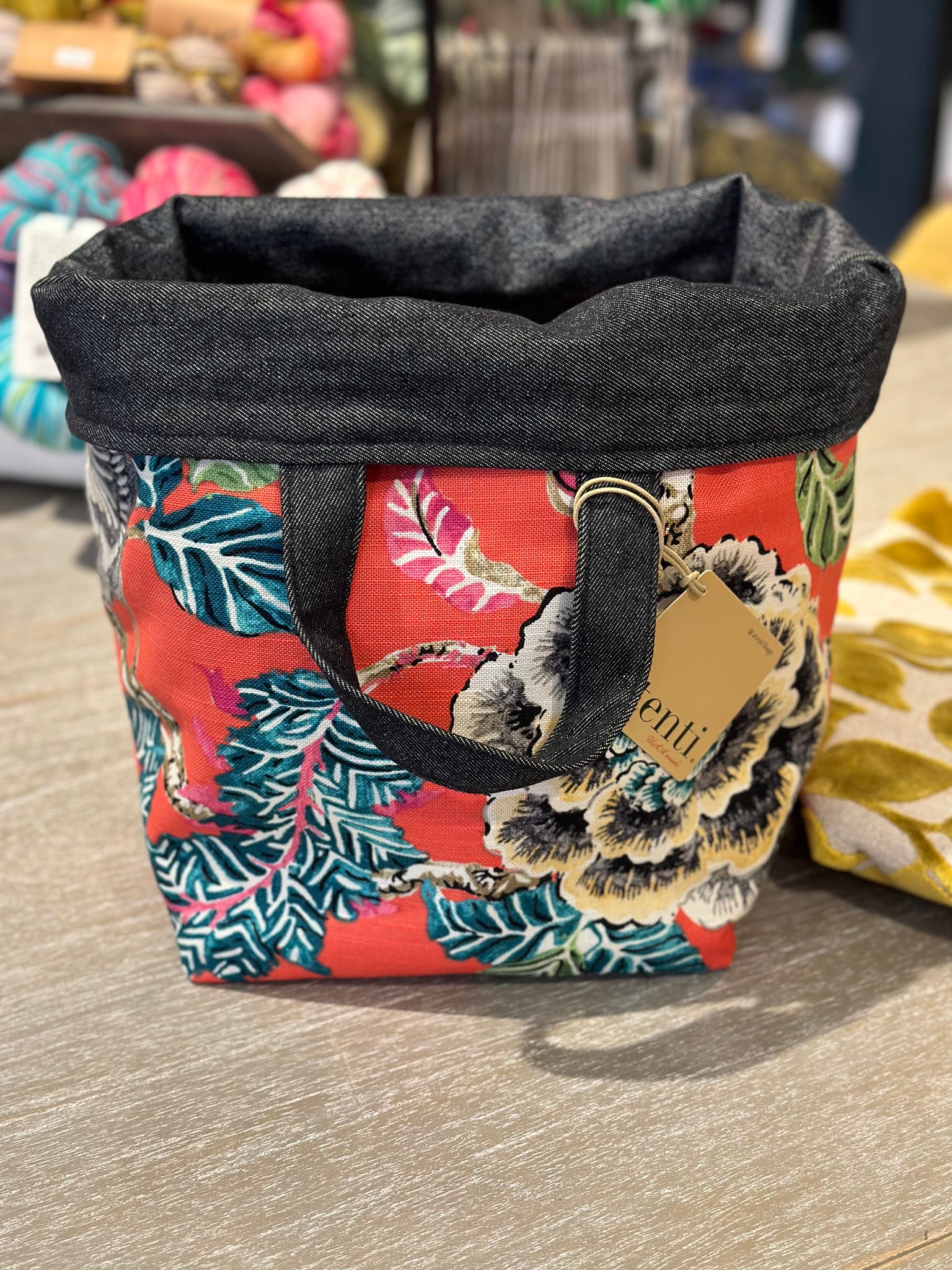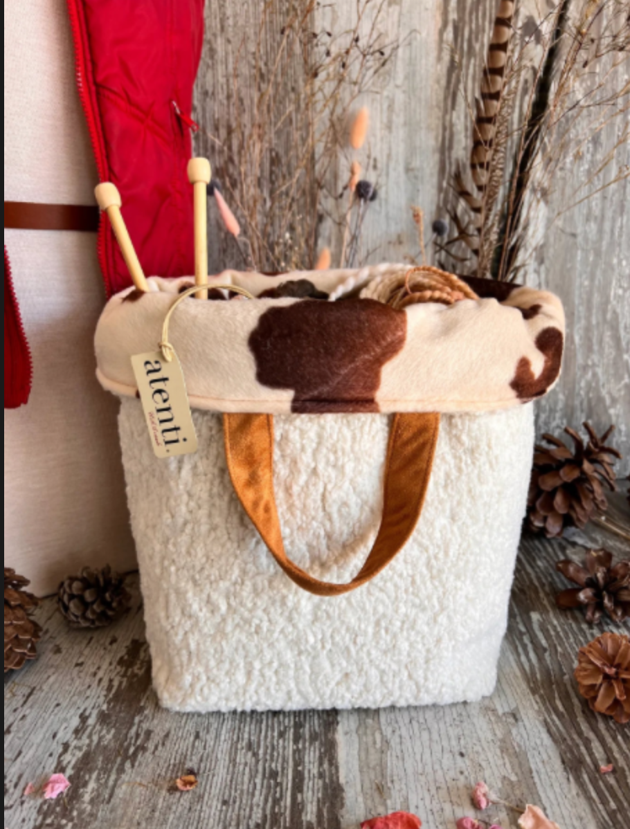 A roomy stand-alone project bag. Top rolls down for easy access. Wide opening and two handles. Fully lined in water our light tan water repellent taffeta. Inside are three pockets.
