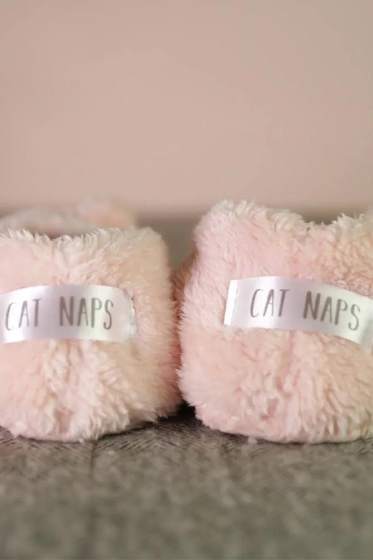 Our Cat Nap footsies are purrrfect for when your cozy toes need rest. They're plush inside and out with an adorable kitty design in front and "Cat Nap" messaging on the back. these cozy pink kitty slippers will be friends to cold toes everywhere.