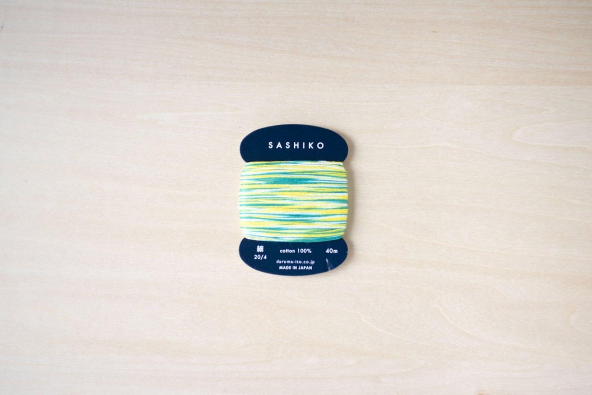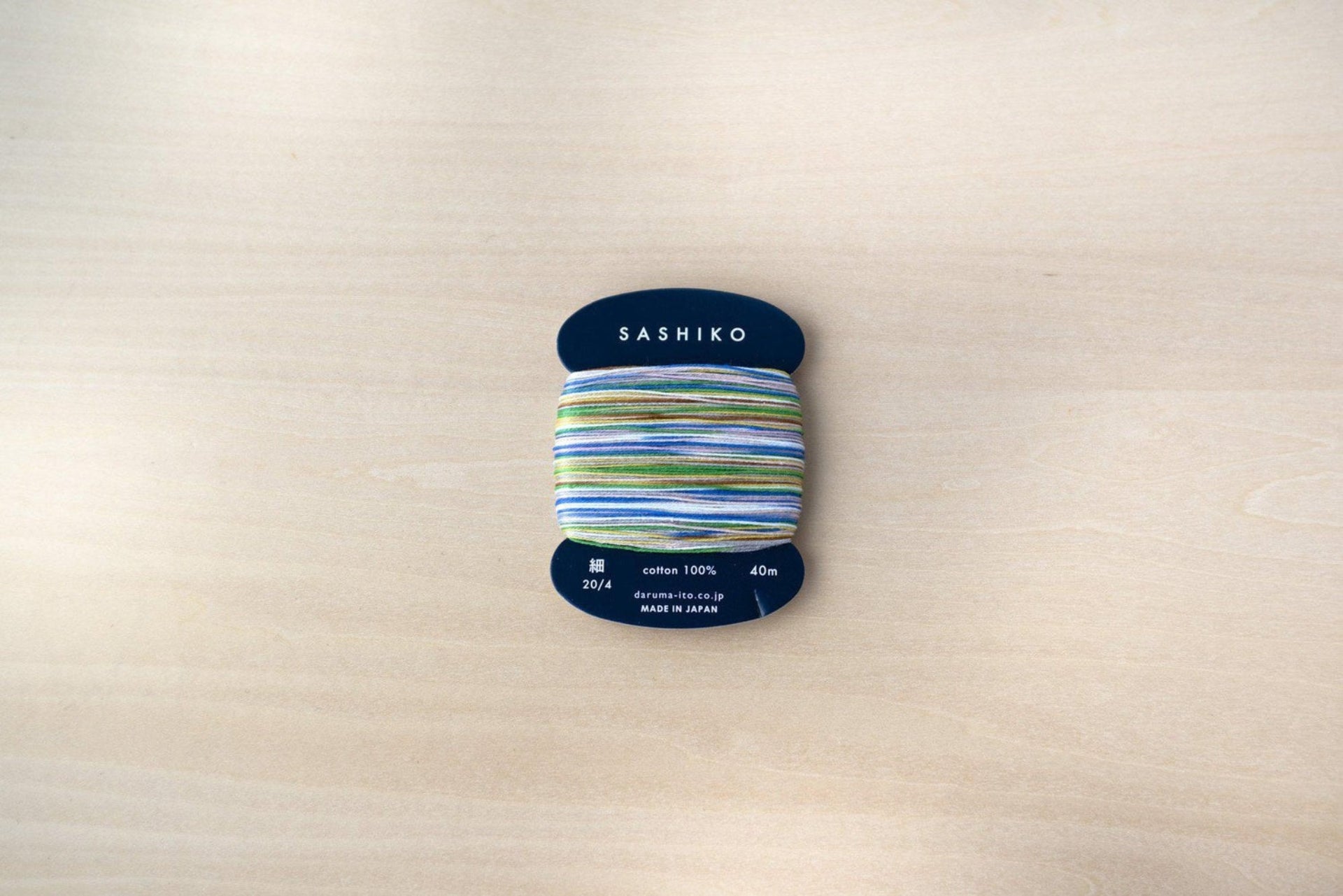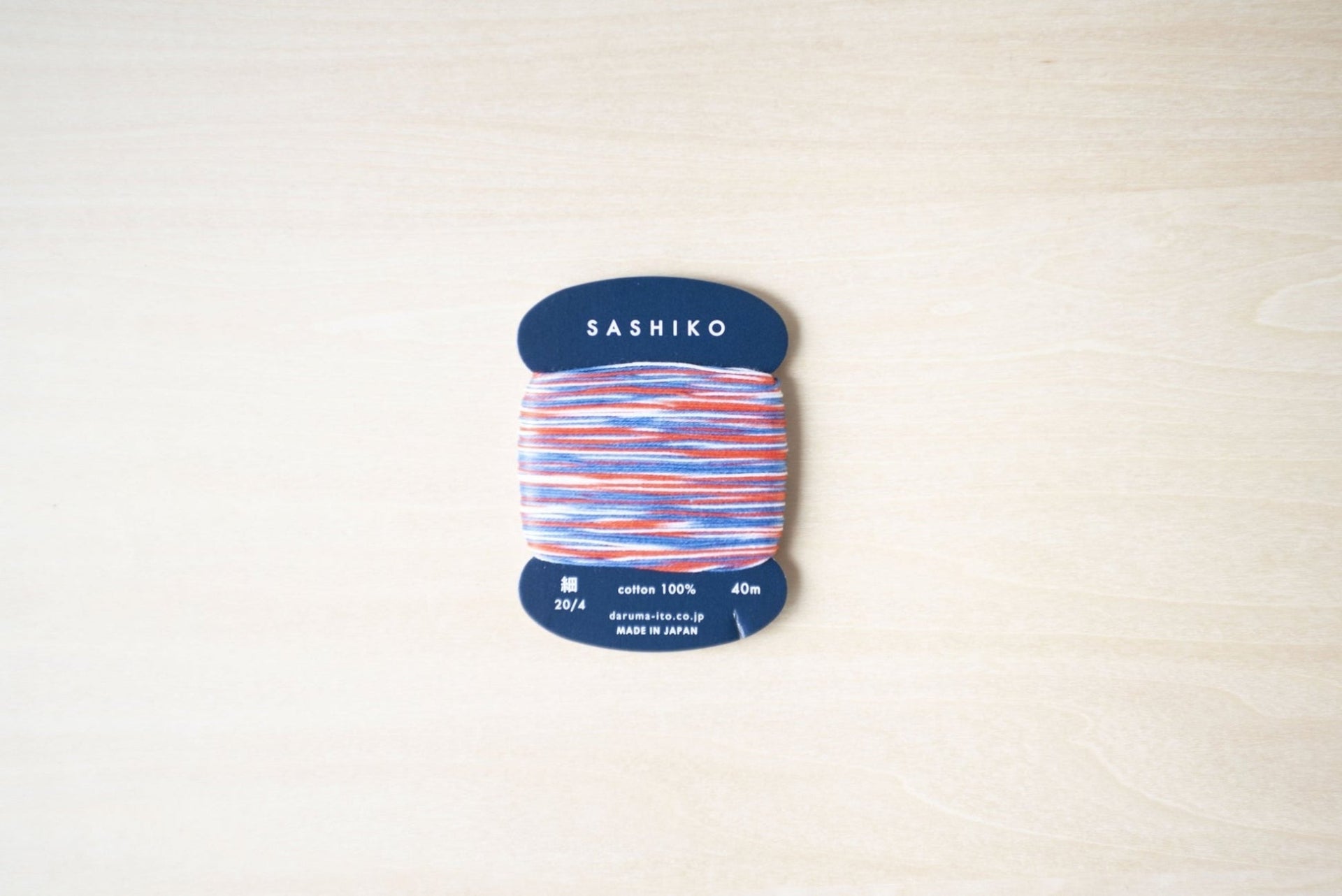 DARUMA's 4-ply standard thickness kasuri-dyed sashiko thread is easy to use with any size pattern. Kasuri dyeing creates dots of color, the threads can be used to stitch patterns as well as single-stitch sashiko. The thread is conveniently wrapped on a card so you can easily cut your desired length and neatly store it.