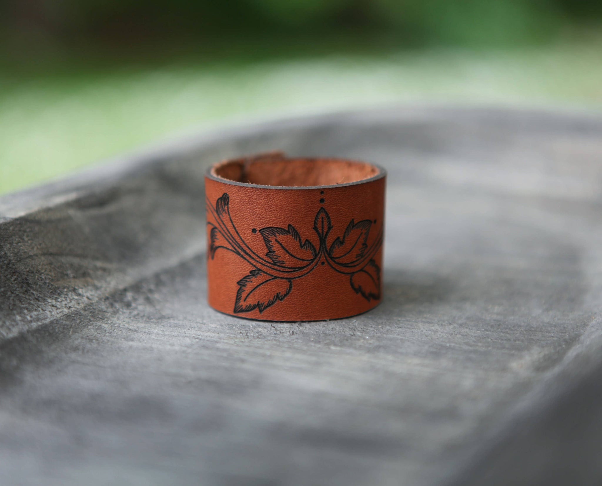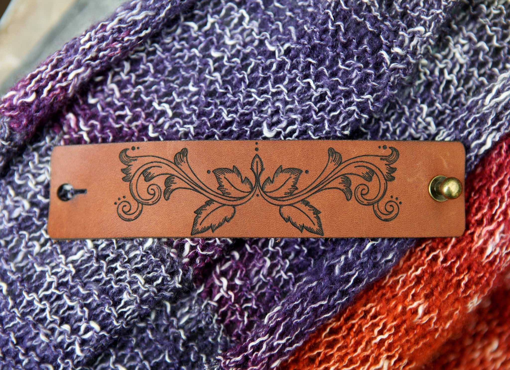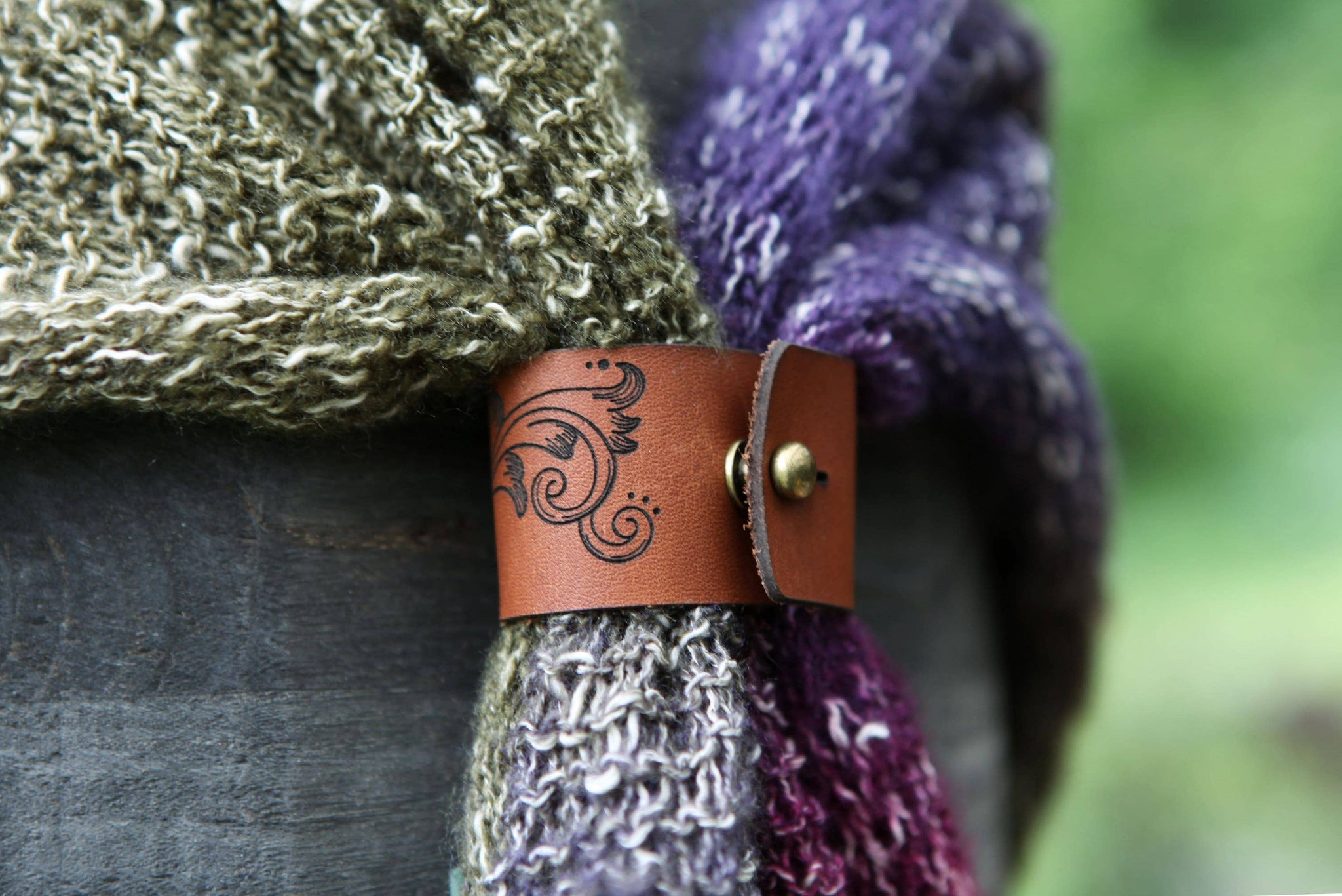 Crafted from 4–5 oz leather with a bronze stud, this filigree leaf scroll cuff elegantly secures your knitted or crocheted shawls, scarves, and cowls. Measures approximately 6" x 1.5" with a 1.5" inside diameter, ideal for lighter-weight pieces. Each cuff is unique, with natural variations in the leather.